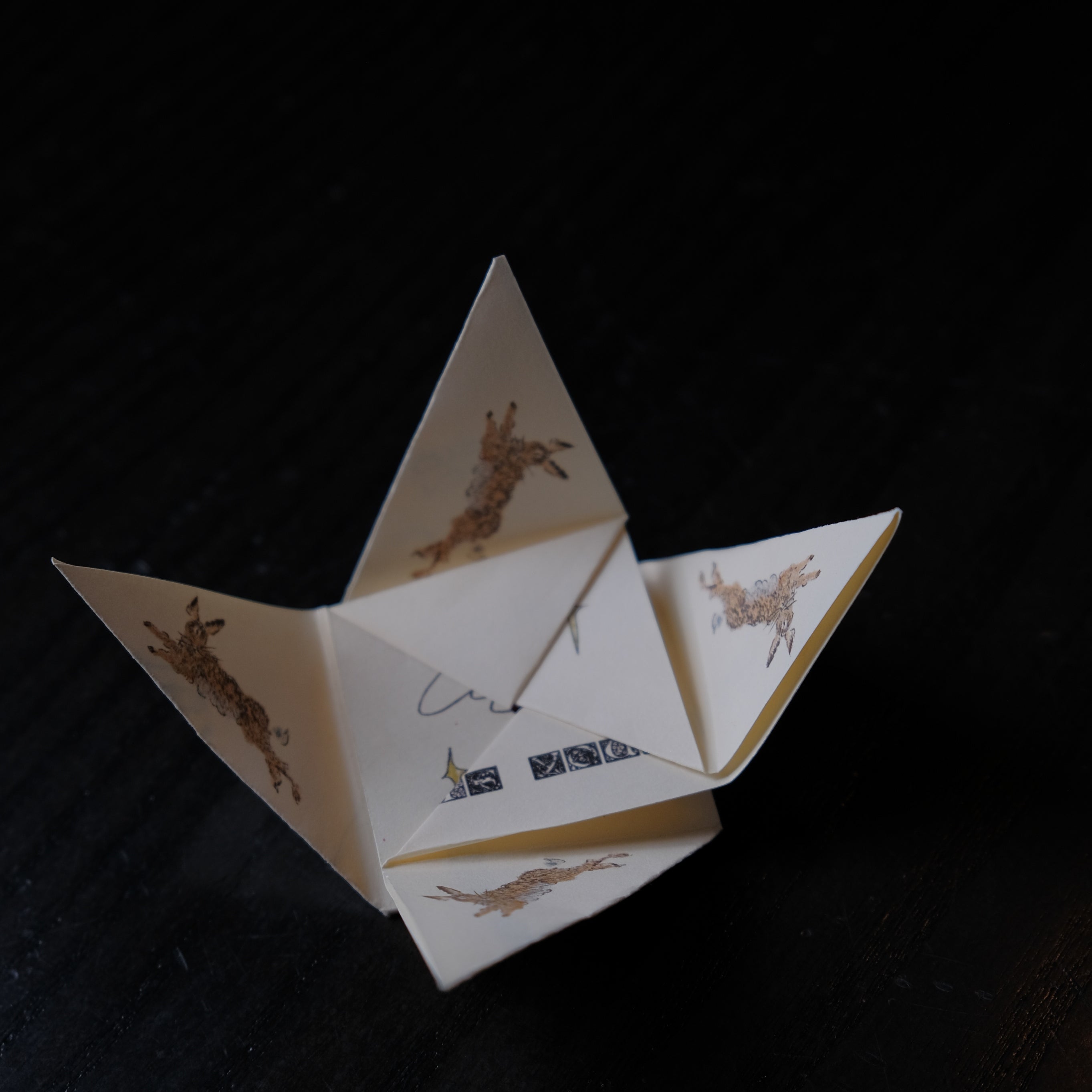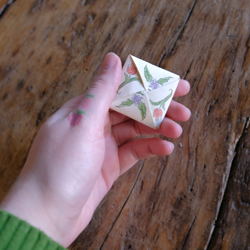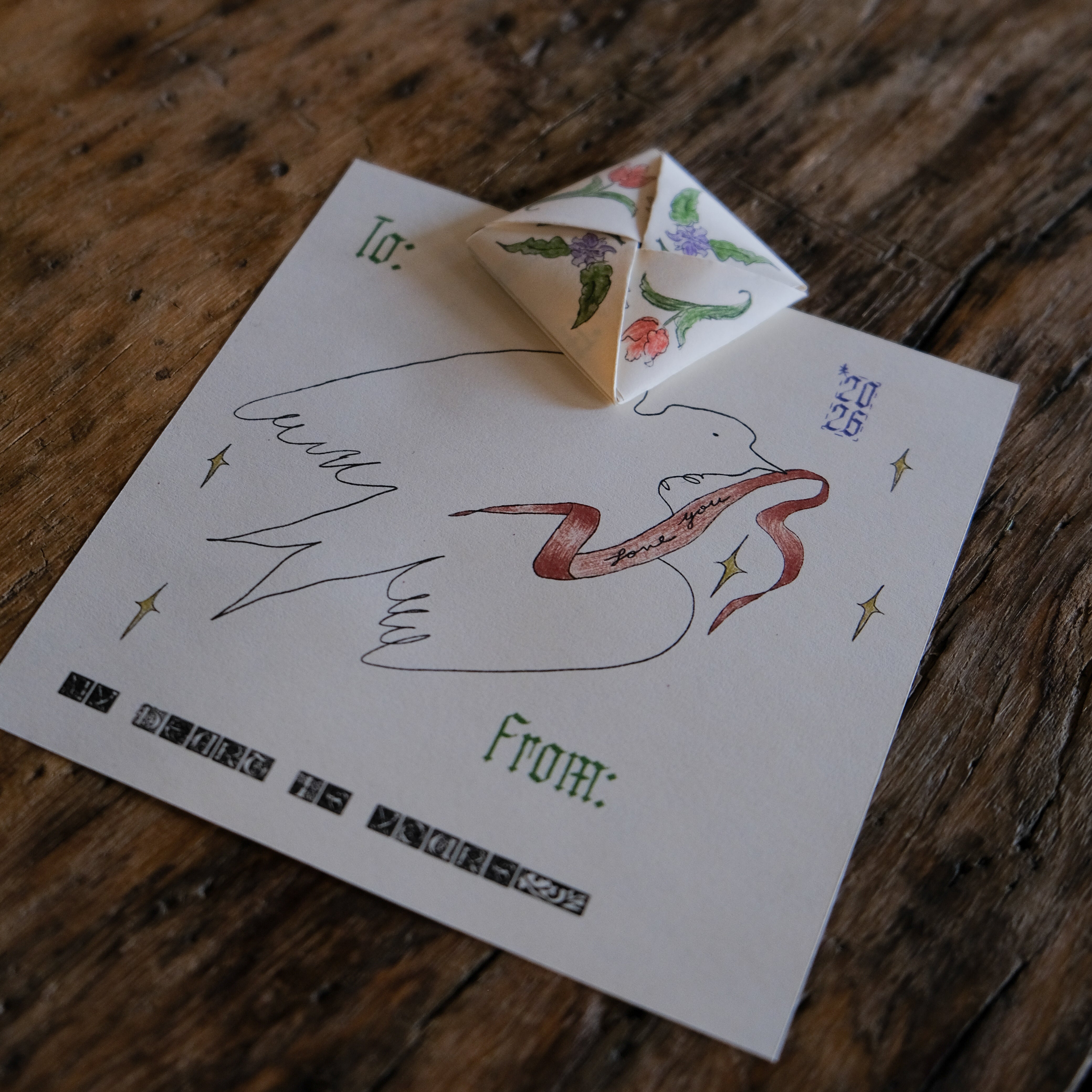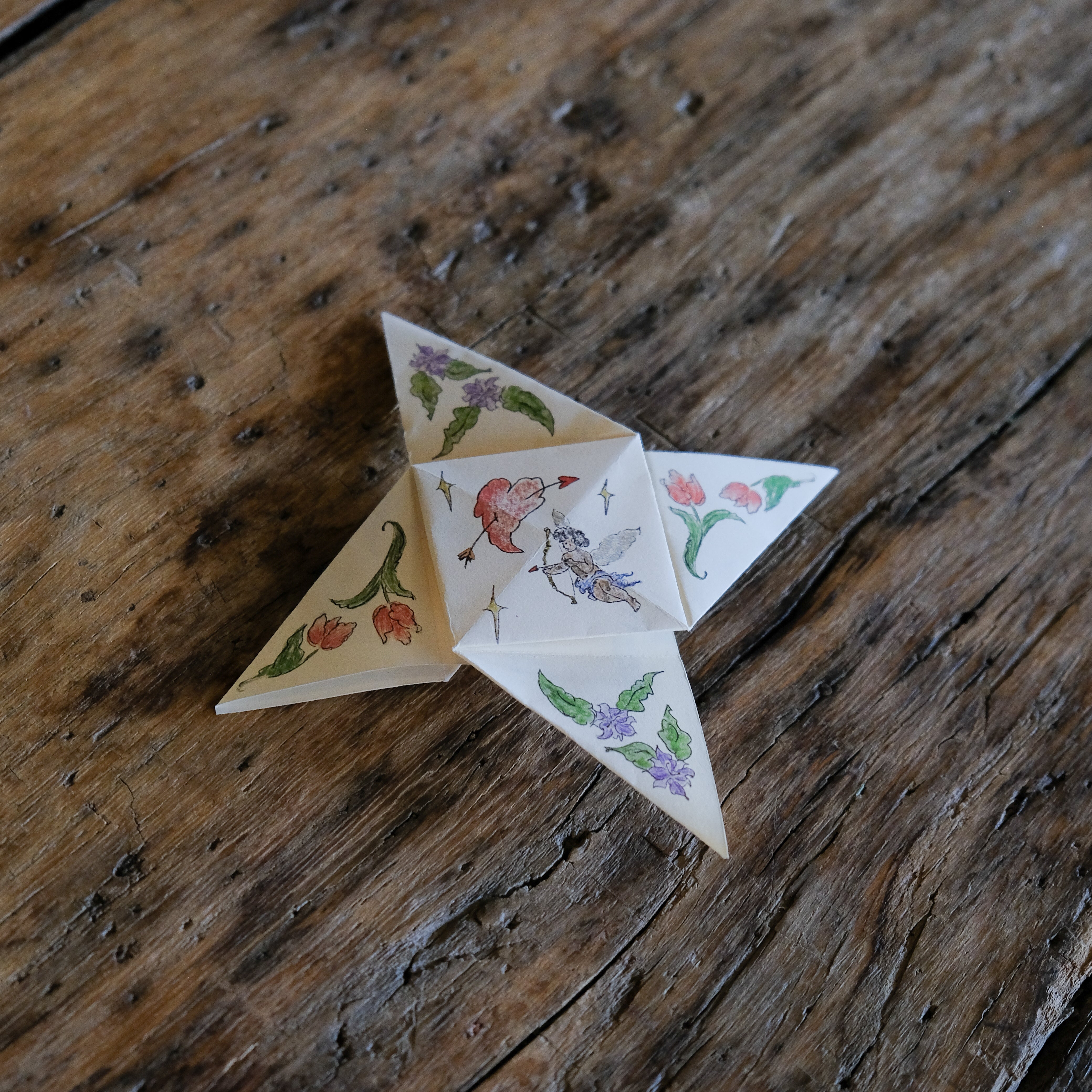 A Valentines Day card based on popular designs from the 18th and 19th century, known as “puzzle purses”. This unique way of folding letters is called itogami or tato and originated in the Hein period in Japan. The design traveled to Europe in the 18th century becoming a popular valentines token as a way to share love poems, trinkets, and secret messages.