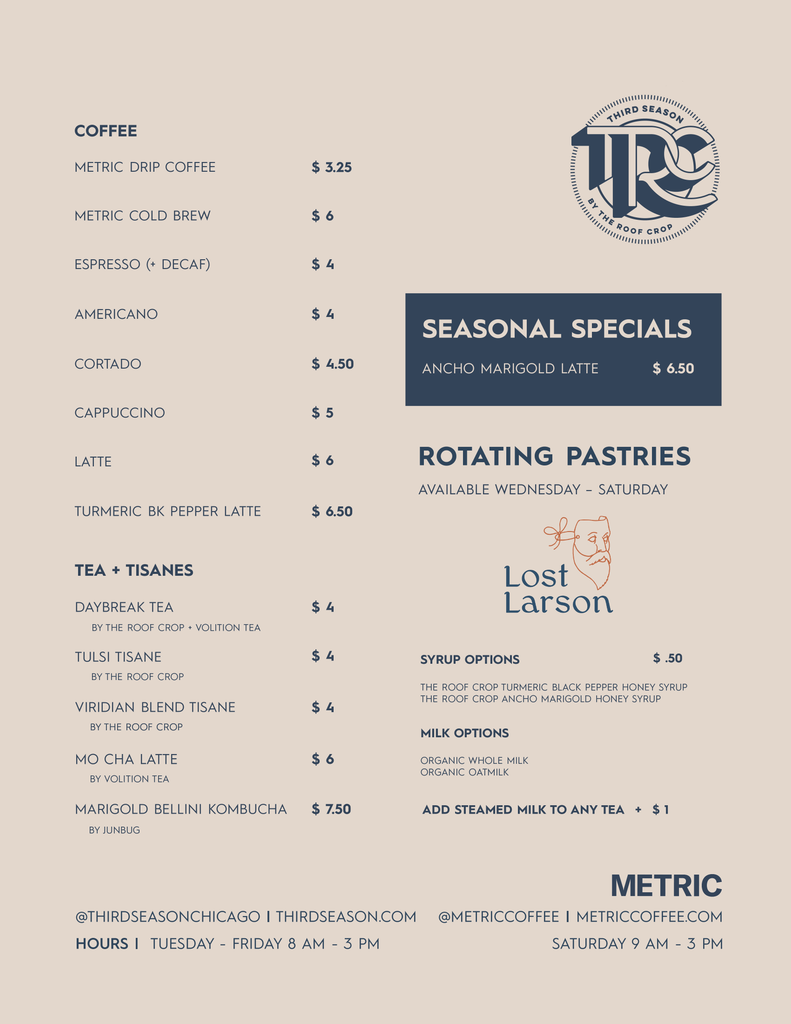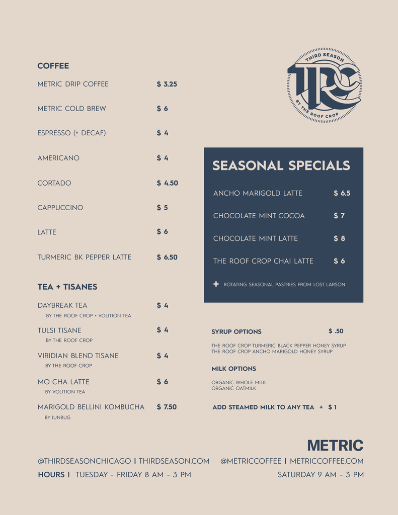 We serve house-blended tisanes from The Roof Crop, alongside sustainably sourced Volition Tea and Metric Coffee.
